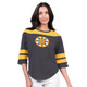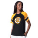 The relaxed fit crew neck crop top is crafted from a soft blend of 60% cotton and 40% polyester jersey. It features a stylish boyfriend fit and is available in a versatile black color, suitable for all teams. The front chest boasts a white sequin-embellished logo, adding a touch of sparkle, while the left cuff is adorned with an embroidered Starter logo, completing the look with a subtle brand signature.